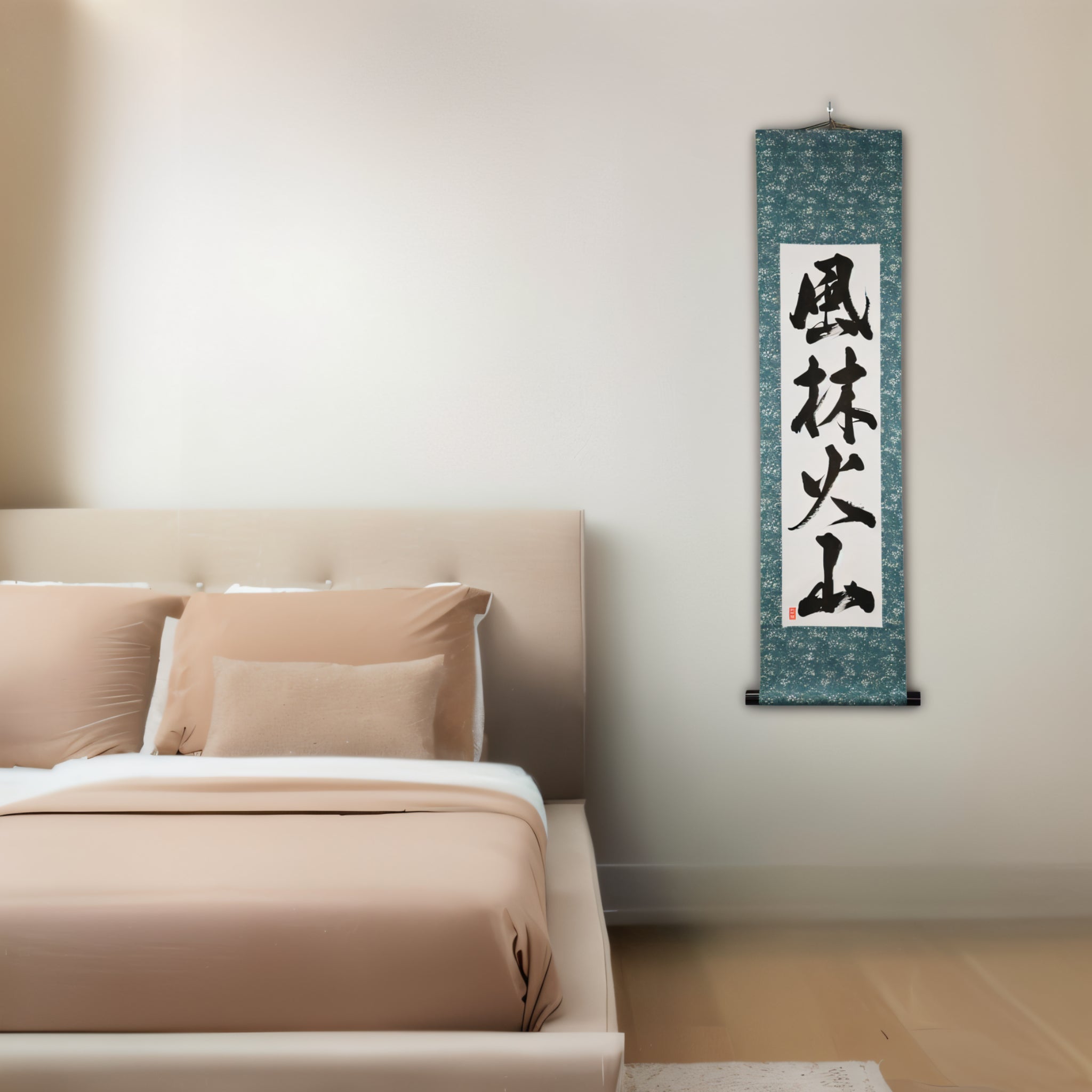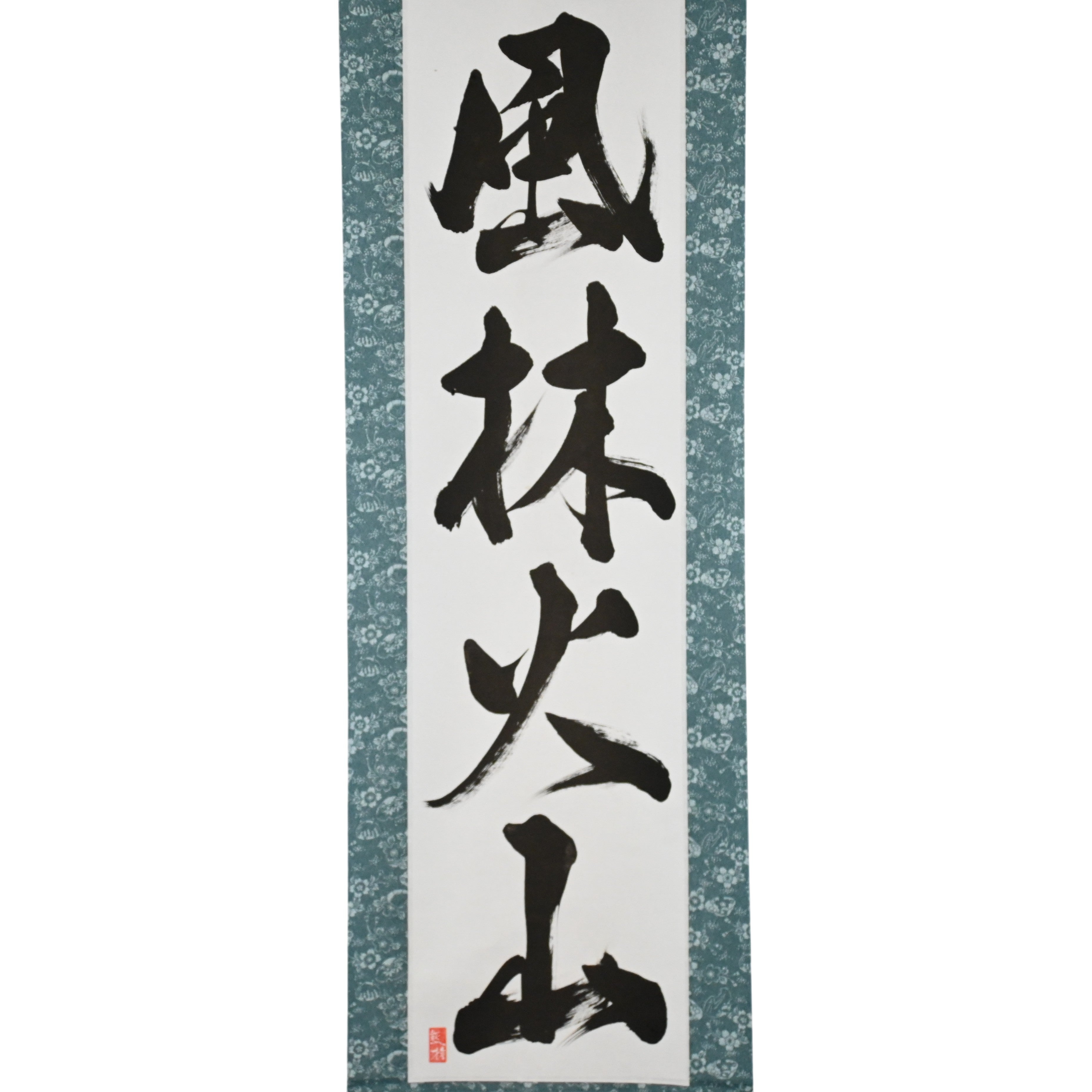 Discover the bold spirit of the Samurai with this powerful Japanese calligraphy scroll featuring 風林火山 (Fūrinkazan) — a legendary phrase immortalized by the great warlord Takeda Shingen (武田信玄), one of Japan’s most iconic figures of the Sengoku era (16th century).