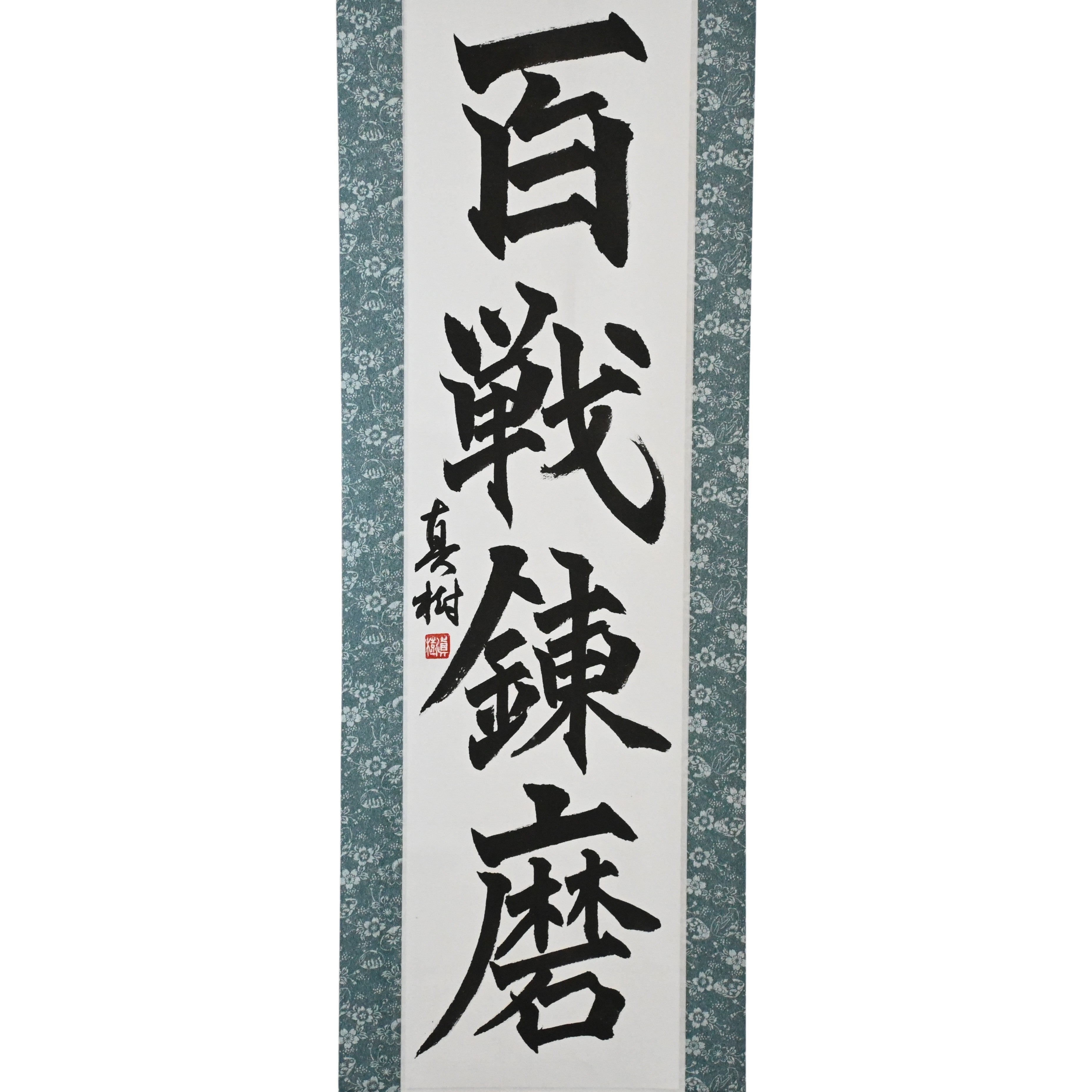 Honor a timeless Japanese saying with this dynamic calligraphy scroll featuring 百戦錬磨 (Hyakusen Renma) — a powerful expression that embodies the samurai spirit of strength, resilience, and mastery gained through enduring countless challenges.