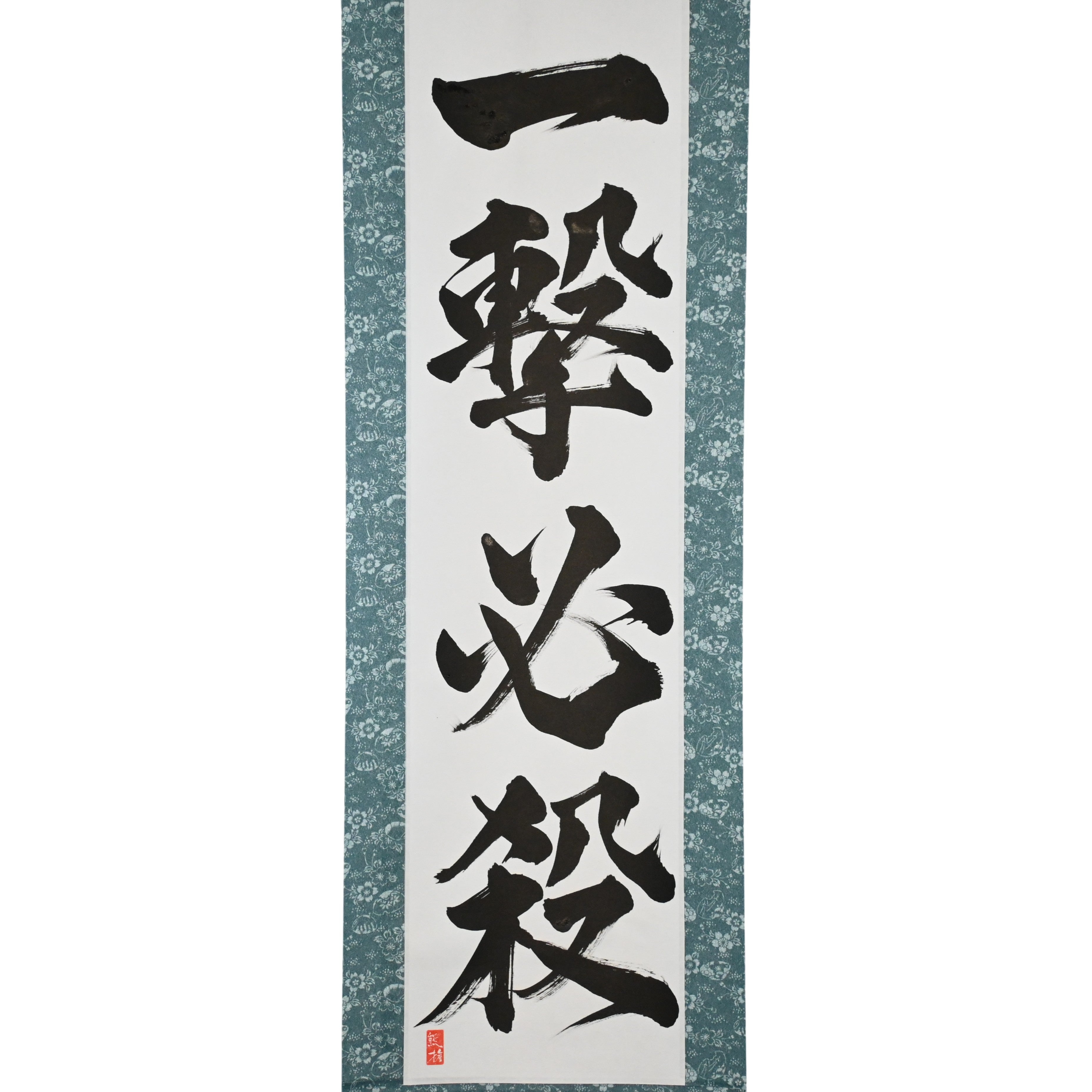 Embodying the core philosophy of Karate, this striking Japanese calligraphy scroll features the phrase 一撃必殺 (Ichigeki Hissatsu) — meaning “One Strike, Certain Kill”. It reflects the ideal of delivering a single, precise, and decisive technique that ends the conflict in an instant.