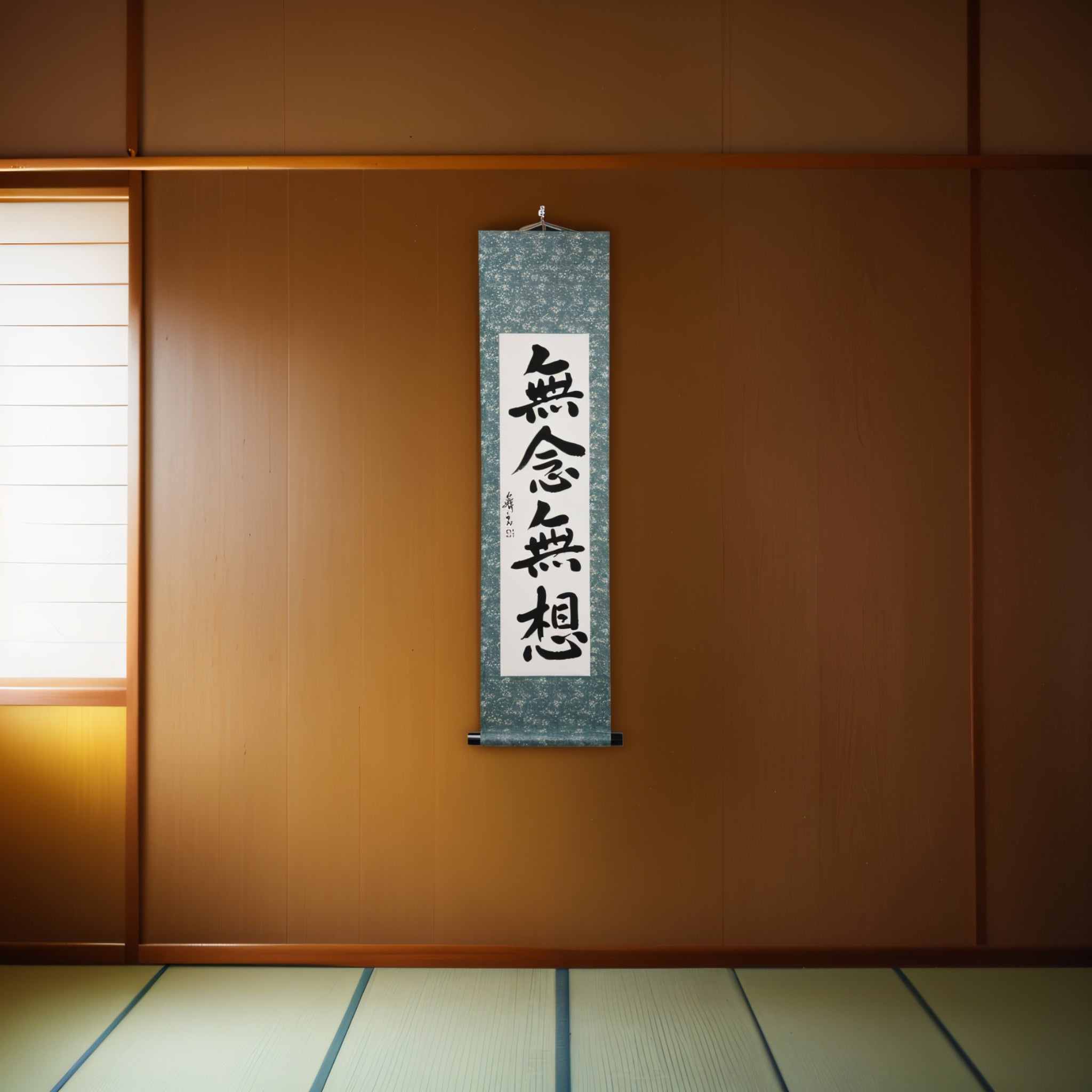 This Japanese calligraphy scroll presents the profound 禅 (Zen) principle 無念無想 (Munen Musō) — a state of mind free from thought and distraction, fundamental to the Samurai’s way. Rooted in both 禅 (Zen) practice and 武士道 (Bushidō), 無念無想 allows the warrior to act with pure presence, responding intuitively and decisively in every moment.