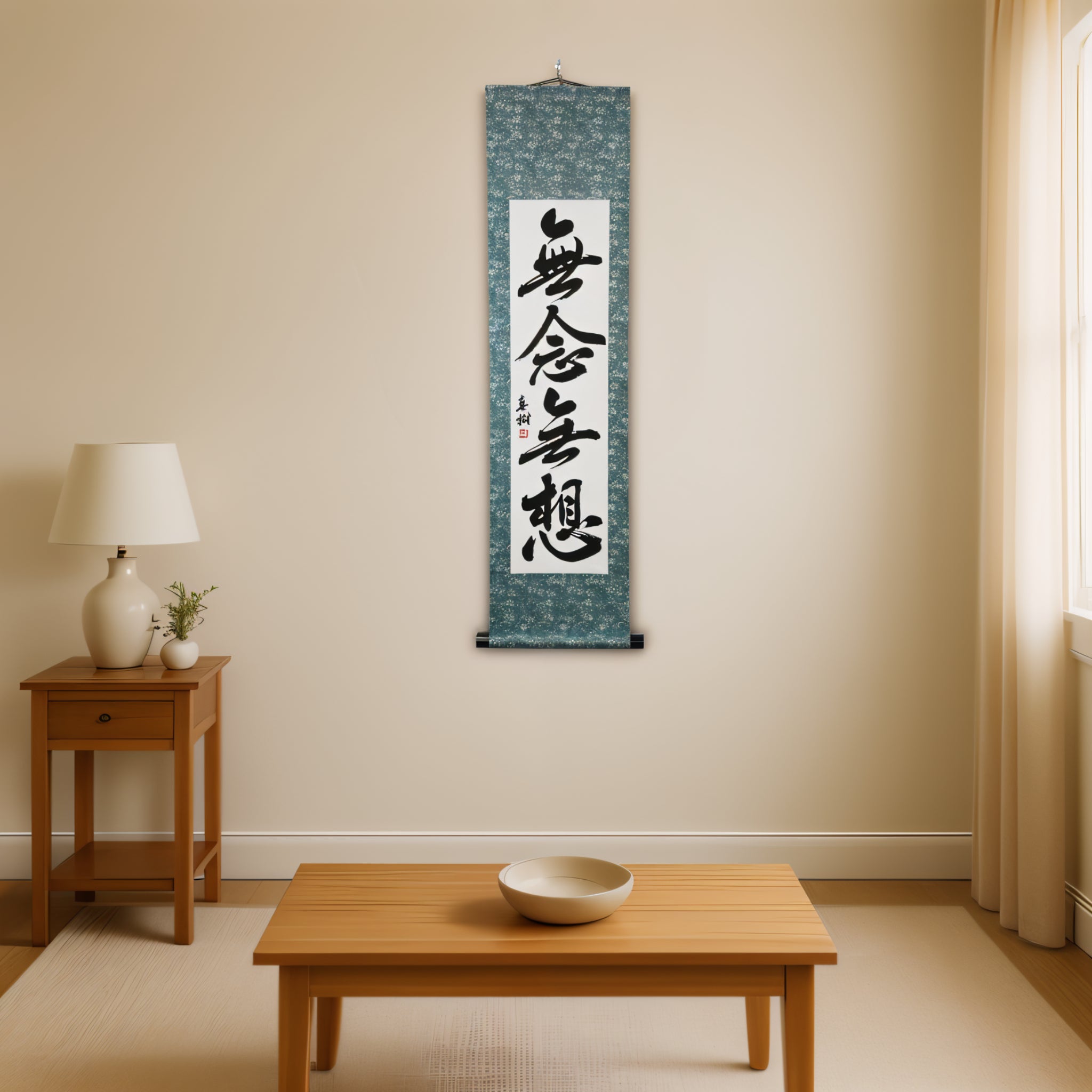This Japanese calligraphy scroll presents the profound 禅 (Zen) principle 無念無想 (Munen Musō) — a state of mind free from thought and distraction, fundamental to the Samurai’s way. Rooted in both 禅 (Zen) practice and 武士道 (Bushidō), 無念無想 allows the warrior to act with pure presence, responding intuitively and decisively in every moment.