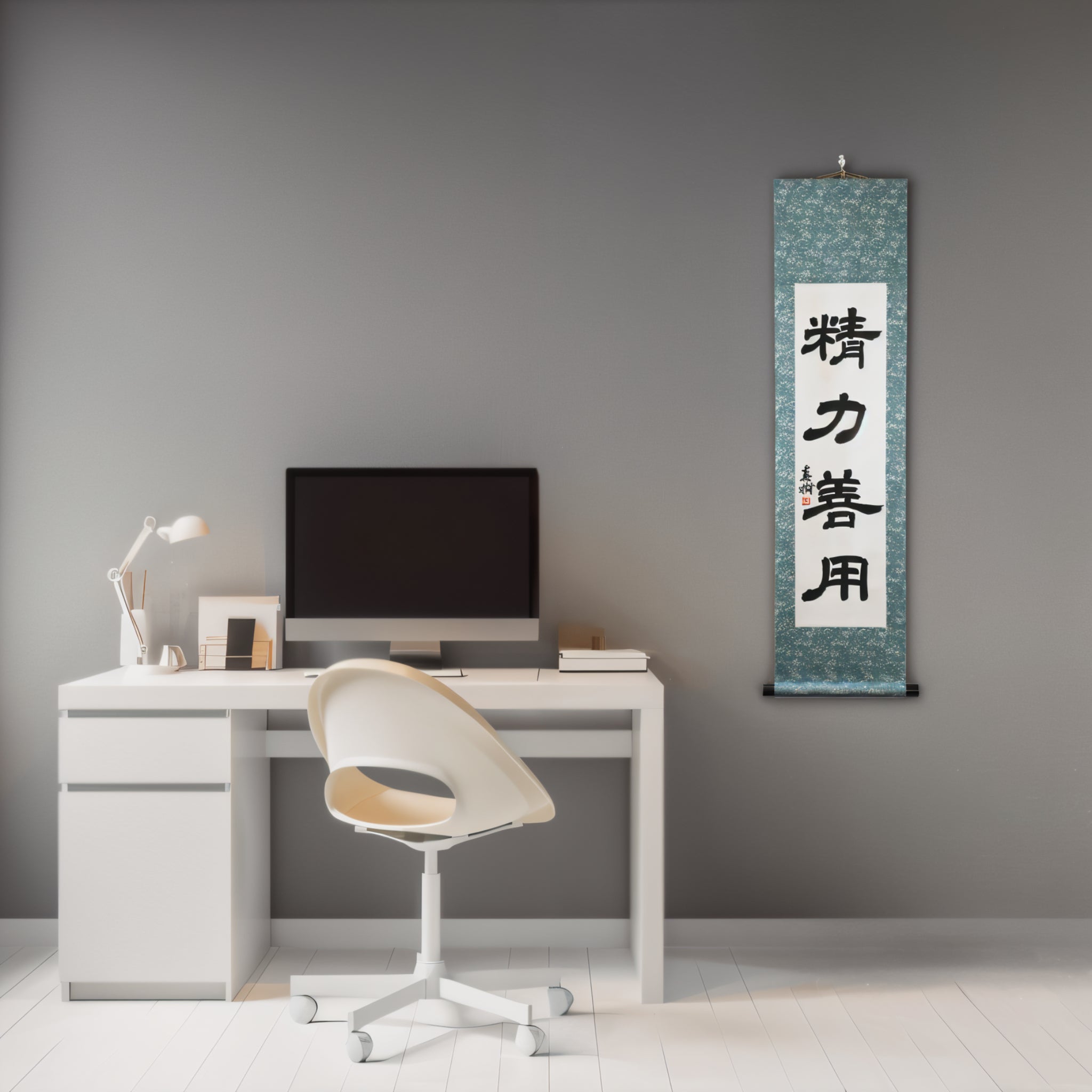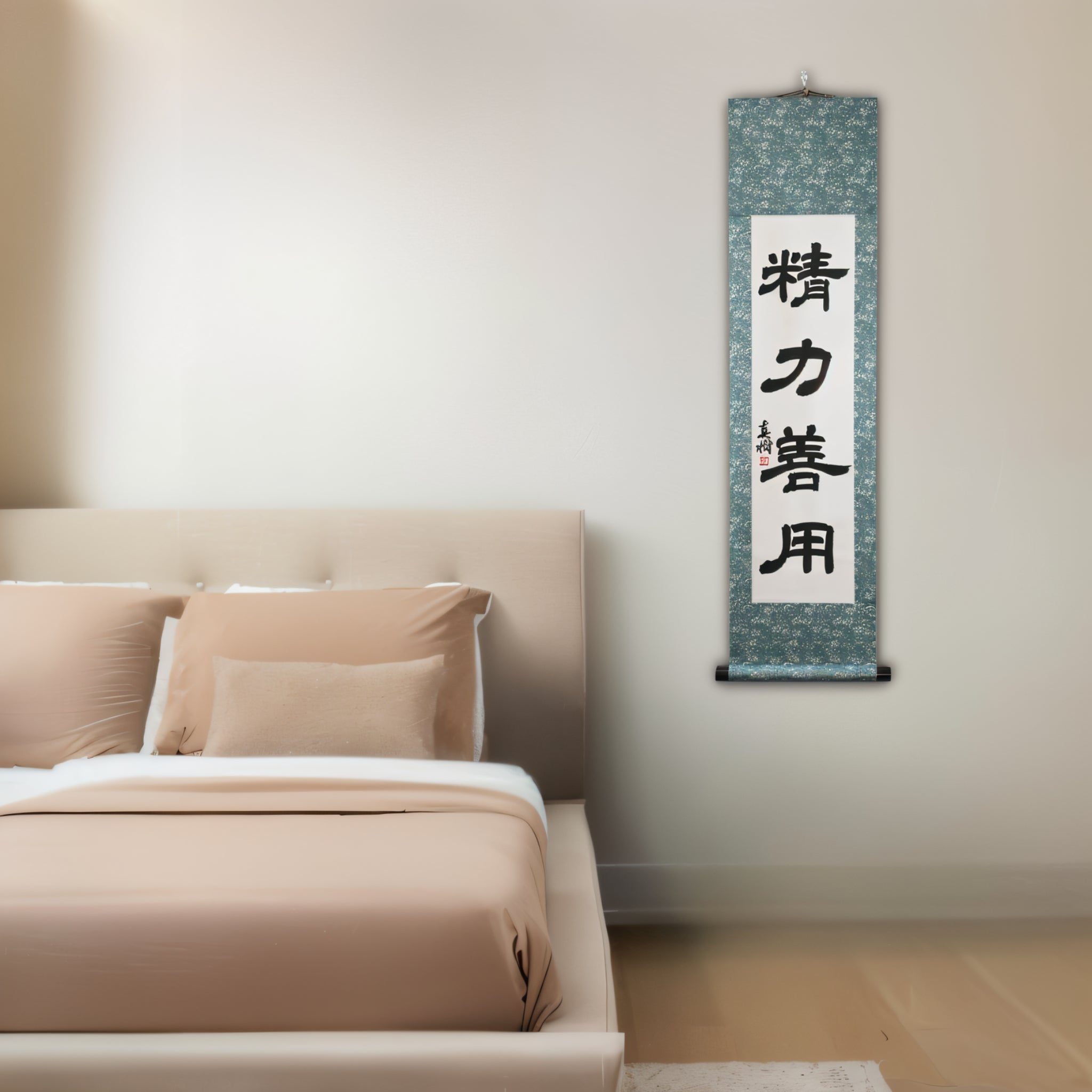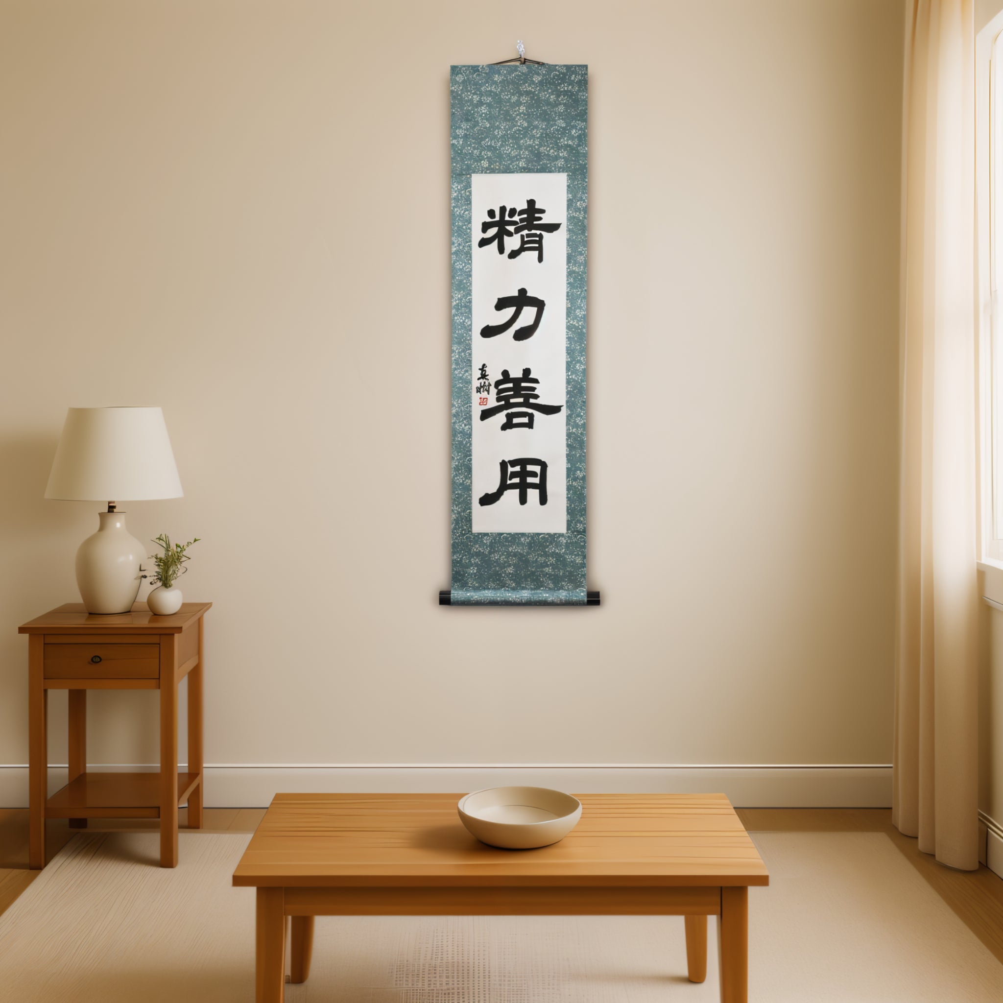 Note: This scroll is written in the traditional Reisho (clerical script) — an ancient calligraphic style known for its quiet elegance and contemplative depth. Its balanced strokes and calm rhythm enhance the serene character of "Seiryoku-Zenyō", giving the piece a timeless, Zen-inspired presence in any interior.